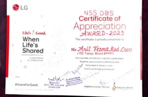 मुख्य अतिथि डॉ० ए एस उनियाल संयुक्त निदेशक उच्च शिक्षा, उत्तराखंड सरकार, कार्यक्रम अध्यक्ष डॉ० अनिल पाल प्राचार्य डीबीएस कालेज, नगर निगम पार्षद योगेश घाघट, एन०एस०एस० अधिकारियों डॉ० बिद्युत बोस, डॉ० आराधना शर्मा व डॉ० शैली, रेड रिबन क्लब प्रभारी डॉ० सोनू द्विवेदी , राजकीय दून मेडिकल कॉलेज ब्लड बैंक अधिकारी डॉ० अंजुम निशान, एनएसएस कमांडर अभय चौहान, पूर्व कमांडर हर्षल दीप सिंह व दीपांशु कोठारी द्वारा अनिल वर्मा “डीबीएस कालेज कालेज सर्टिफिकेट ऑफ एप्रीसिएशन अवॉर्ड -2025 , शील्ड ऑफ अवॉर्ड अवाrड, पुष्प गुच्छ आदि भेंट किए।