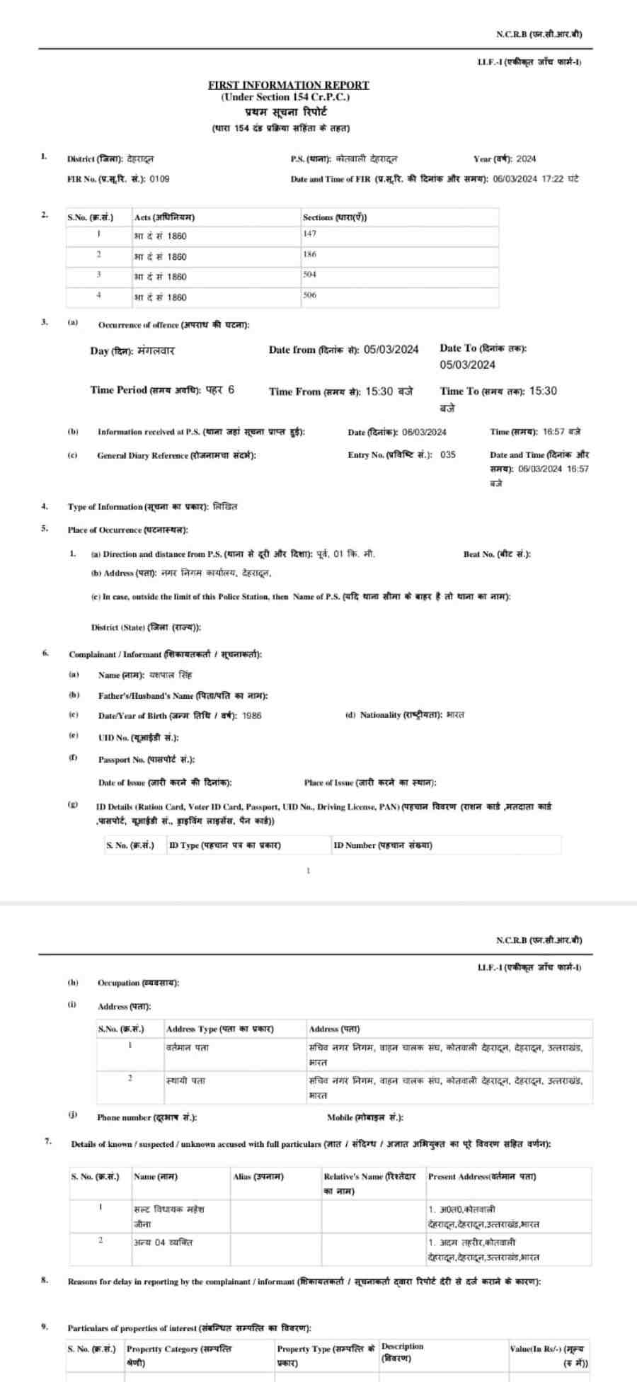 देर रात यह मुकदमा आईपीसी की धारा 147, 186, 504 व 506 के तहत विधायक जीना समेत 05 के विरुद्ध दर्ज किया गया,