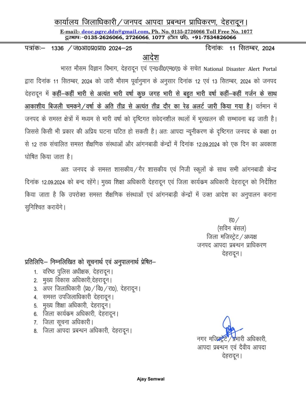 डीएम देहरादून के दिशा निर्देश पर जारी किया आदेश।