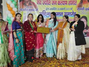 कार्यक्रम में मुख्य वक्ता डॉक्टर ममता कुंवर ने समाज में महिलाओं की भूमिका पर प्रकाश डालते हुए कहा कि वर्तमान में सोशल मीडिया द्वारा समाज में जो विकृतियों फैल रही है उनके कुप्रभाव से किस तरह से बच्चों को बचा जाए , विषय पर महिलाओं एवं किशोरियों को जागरूक किया। कार्यक्रम की अध्यक्षता कर रही गीता सावन ने कहा कि मानसी खत्री उत्तराखंड की सबसे कम उम्र की क्षेत्र पंचायत सदस्य रही हैं वह निरंतर युवाओं और महिलाओं के लिए प्रेरणा स्रोत हैं जिस प्रकार वह महिलाओं को उनके साथ होने वाले अपराधों को रोकने व उससे सुरक्षित रखने के तौर तरीकों के प्रति सबको जागरुक कर रही हैं वह काबिले तारीफ है। नवज्योति जन कल्याण समिति की अध्यक्ष सुशीला खत्री द्वारा बताया गया कि महिलाओं द्वारा समाज के विभिन्न क्षेत्रों में निस्वार्थ भाव से कार्य करने के जज्बे को देखते हुए, उन महिलाओं को शॉल ,प्रमाण पत्र, स्मृति चिन्ह देकर सम्मानित किया गया।