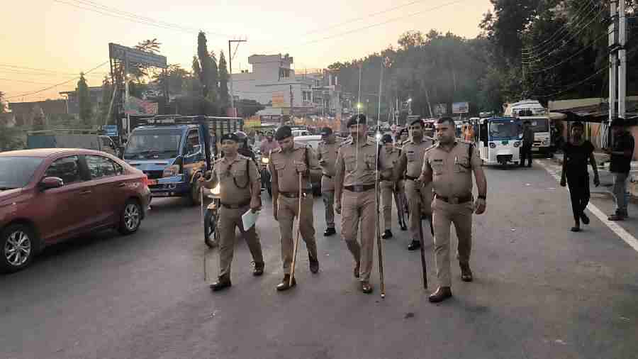 इसी क्रम में आज दिनाँक 11/10/2024 को पुलिस की अलग-अलग टीमों द्वारा सभी थाना क्षेत्रों में भीड-भाड वाले स्थानों/मुख्य बाजारों तथा मुख्य मार्गों पर पैदल गश्त कर संदिग्ध व्यक्तियों से पूछताछ की गई, साथ-साथ महत्वपूर्ण/संवेदनशील प्रतिष्ठानों व स्थानों में सुरक्षा व्यवस्थाओं का जायजा लिया गया। इस दौरान विभिन्न कार्यालयो में नियुक्त पुलिस बल को भी स्थानीय पुलिस के सहयोग के लिए अलग-अलग थाना क्षेत्रों में यातायात / सुरक्षा व्यवस्था हेतु नियुक्त किया है।