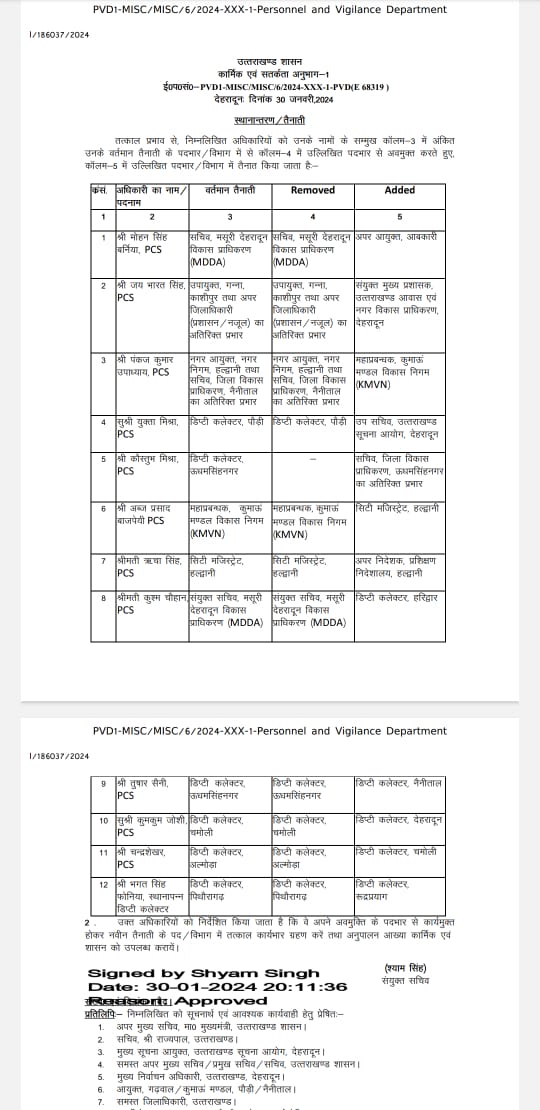 कुश्म चौहान को संयुक्त सचिव एमडीडीए से हटाकर डिप्टी कलेक्टर हरिद्वार बनाया गया,