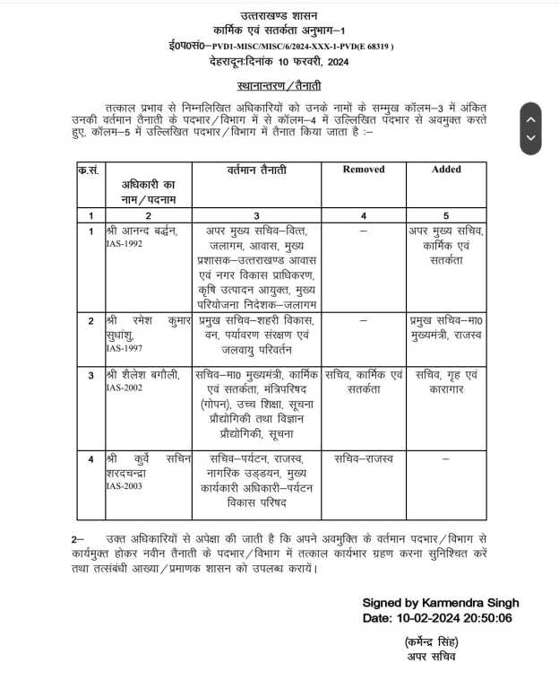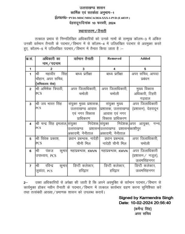 Pcs अधिकारी महावीर सिंह चौहान को अपर सचिव आपदा प्रबंधन के जिम्मेदारी, अभिषेक त्रिपाठी कोमुख्य विकास अधिकारी टिहरी गढ़वाल बनाया गया, जय भारत सिंह को अपर जिलाधिकारी देहरादून बनाया गया, चंद्र सिंह इमलाल को अपर आयुक्त गन्ना काशीपुर बनाया गया, विवेक प्रकाश को अपर जिलाधिकारी चमोली बनाया गया, पंकज उपाध्याय को अपर जिलाधिकारी उधम सिंह नगर की जिम्मेदारी, रविंद्र कुमार को डिप्टी कलेक्टर उधम सिंह नगर बनाया गया
